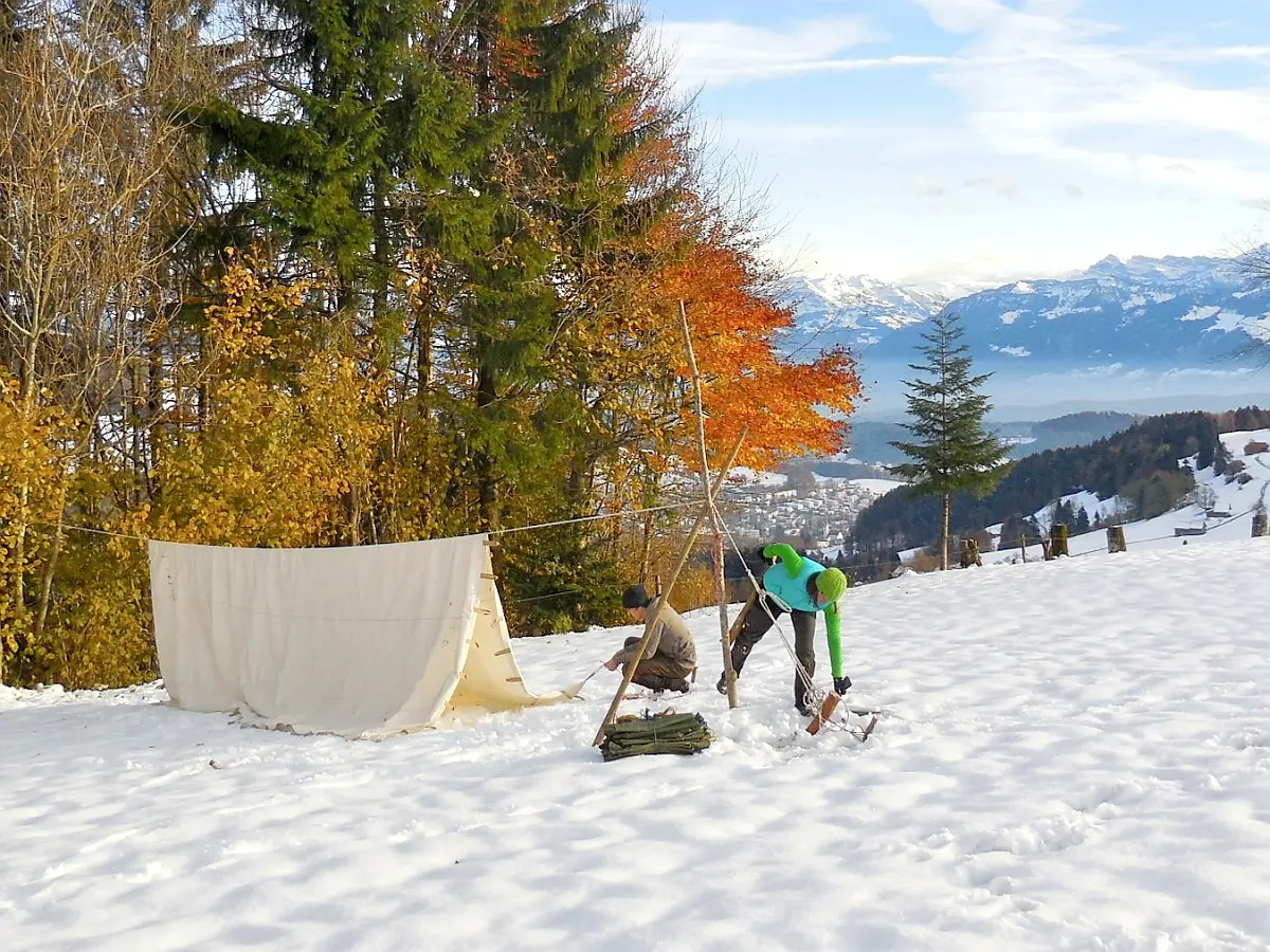 Draussen zu Hause: Feuerkunde, Seil und Knotentechnik, Gruppe vor Witterung schützen. Achtsamer Auf- und Abbau einer Camp-Einrichtung, Witterung adäquat abschätzen, Verantwortung für die Gruppe tragen.